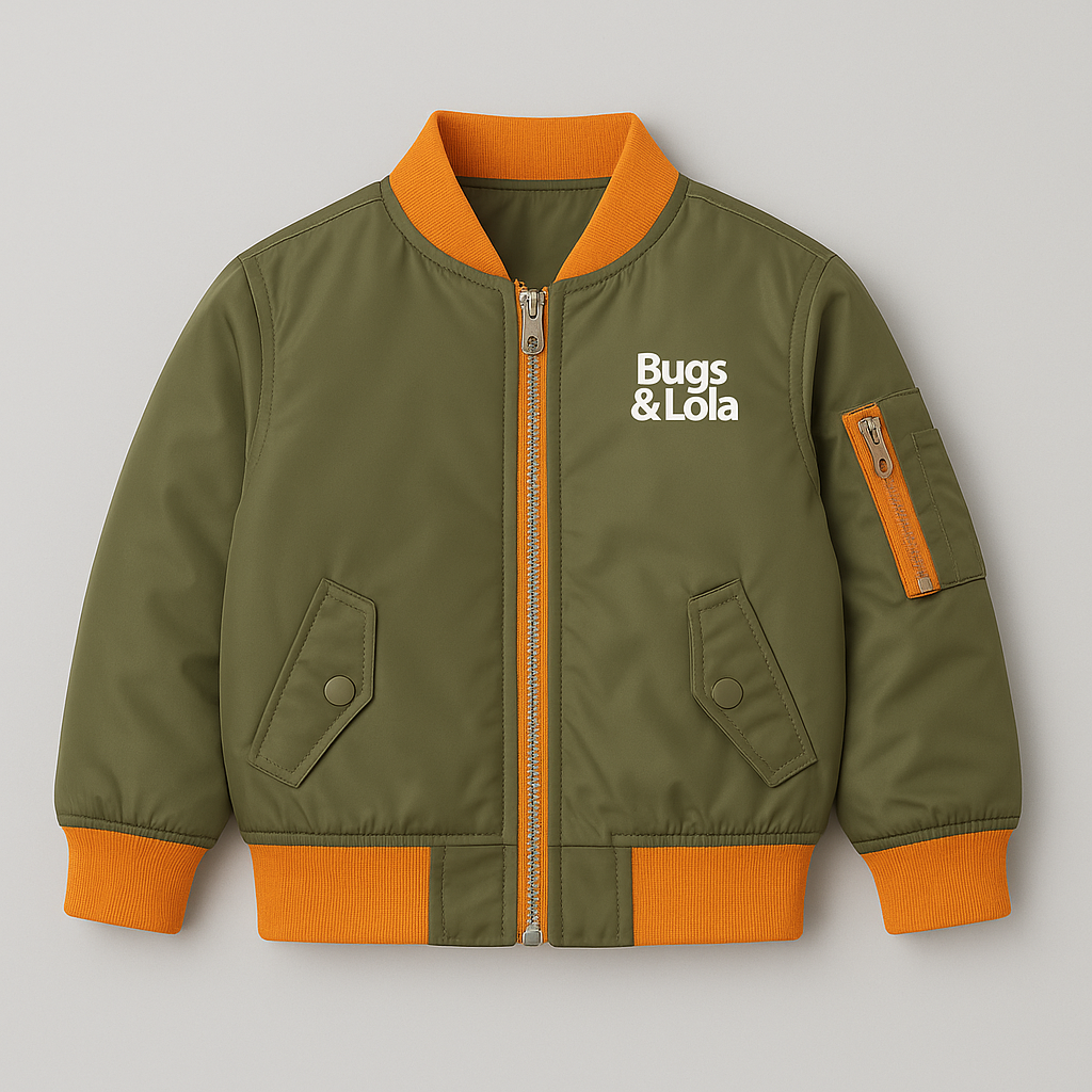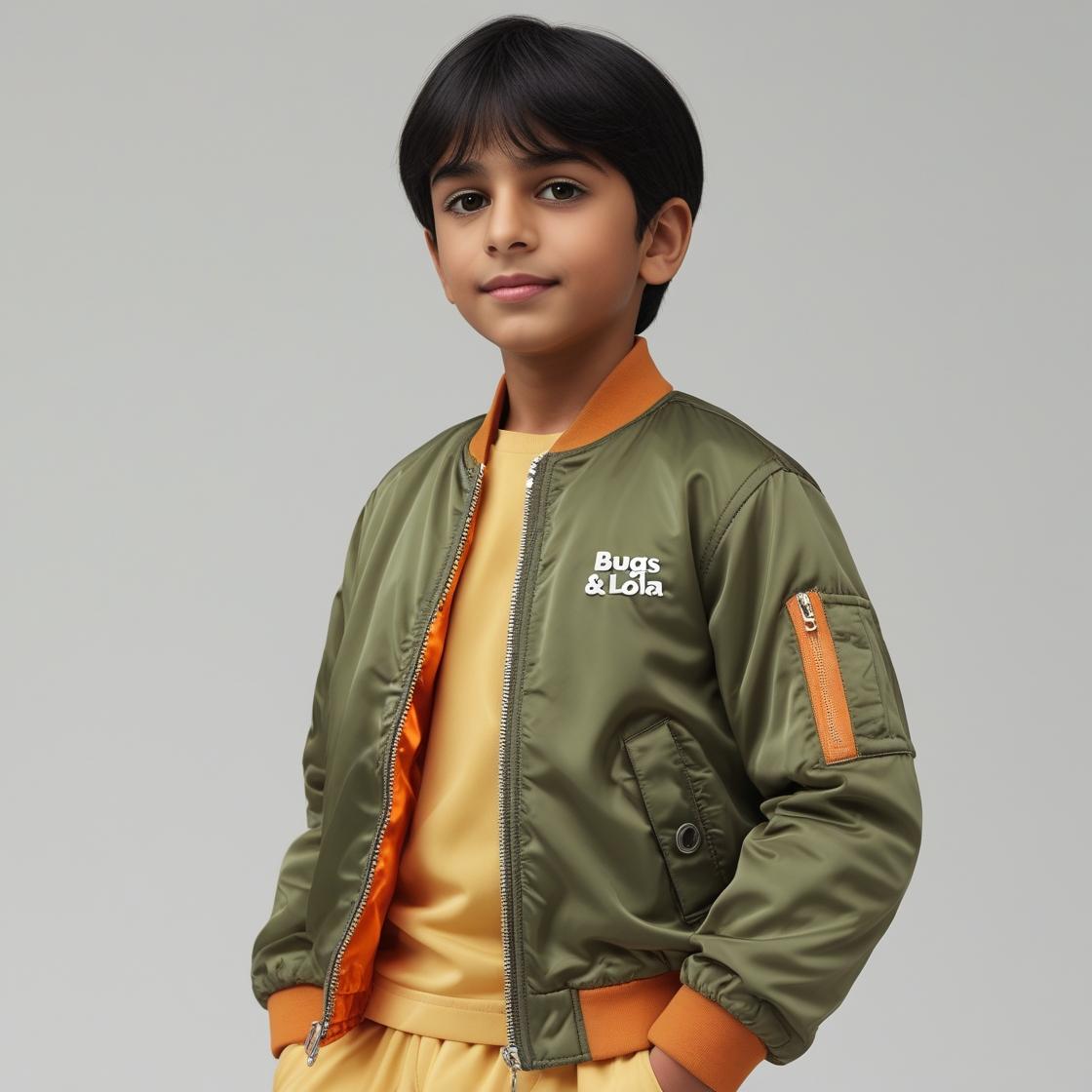Give your child a stylish edge with the Bugs & Lola Premium Kids Satin Bomber Jacket – Olive Green with Orange Lining. Designed for everyday wear and special occasions, this bomber jacket blends premium satin craftsmanship with a trendy, streetwear-inspired design.