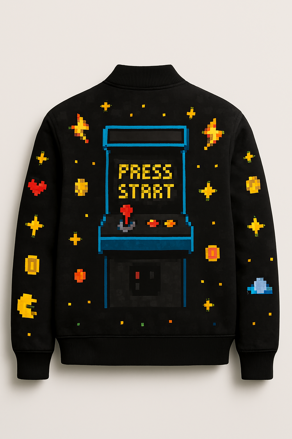 Let your child power up their winter wardrobe with this bold and nostalgic Level Up fleece bomber jacket. Designed in classic black, this jacket features vibrant pixel art graphics inspired by retro video games—think Pac-Man, pixelated avatars, cherries, stars, joysticks, and the iconic “LEVEL UP” patch.