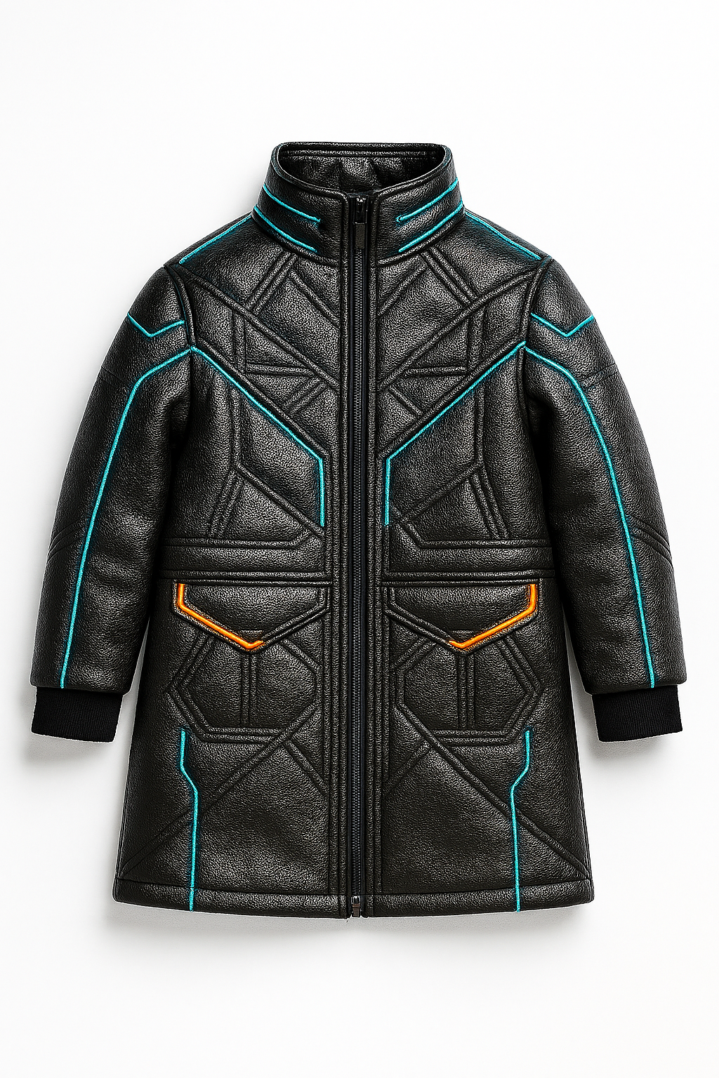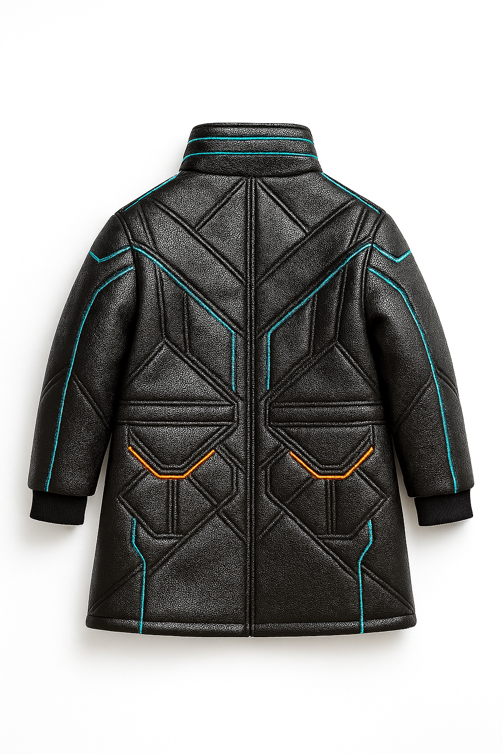 Step into the future with our Real Leather Futuristic Kids Coat, designed for children aged 2 to 12. Crafted from premium black leather, this coat features a structured silhouette with geometric paneling, bold turquoise piping, and orange pocket accents—perfect for kids who love to stand out.