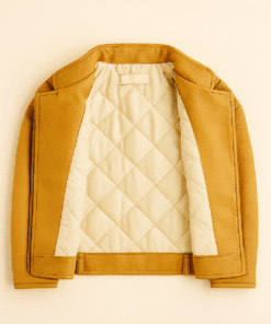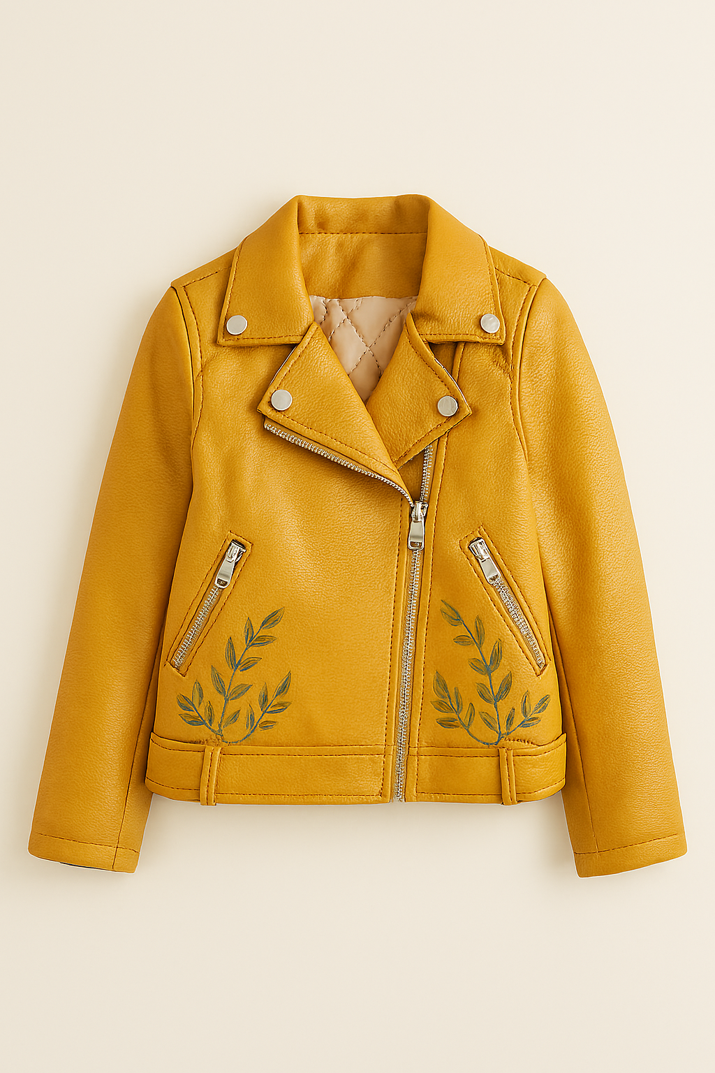 Bright, bold, and beautifully crafted—our Real Leather Kids Biker Jacket in mustard yellow is designed for children aged 2 to 12 who love to stand out. Made from genuine leather, this jacket features an asymmetrical front zipper, silver snap buttons, and playful green leaf embroidery near the hem for a nature-inspired twist.