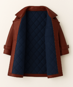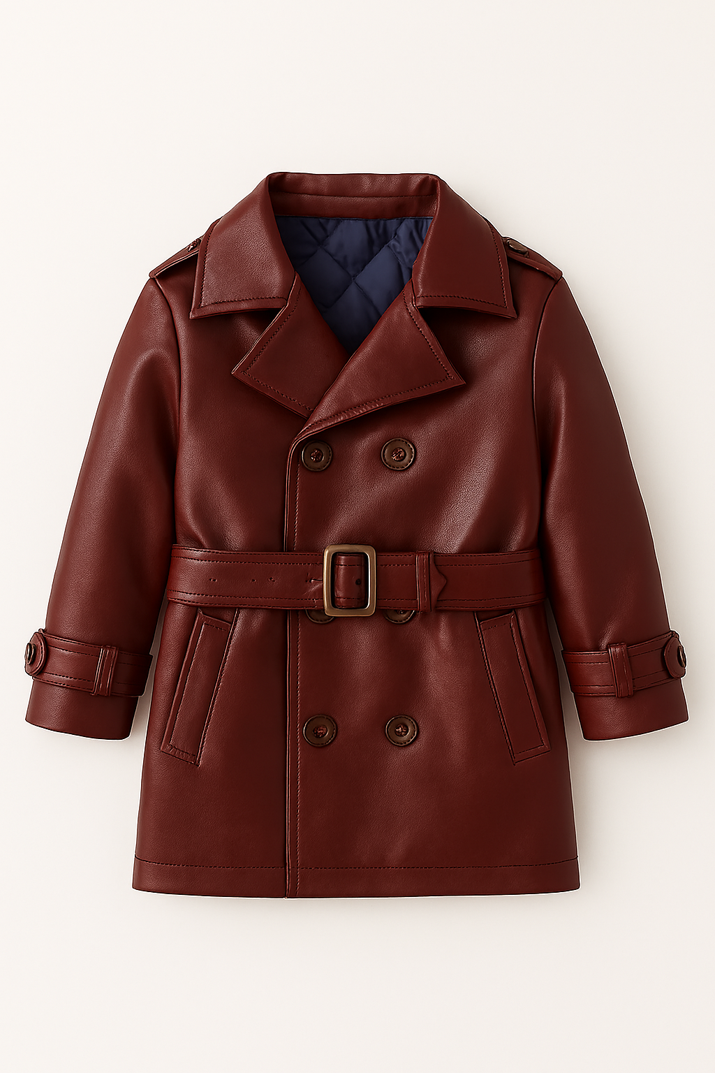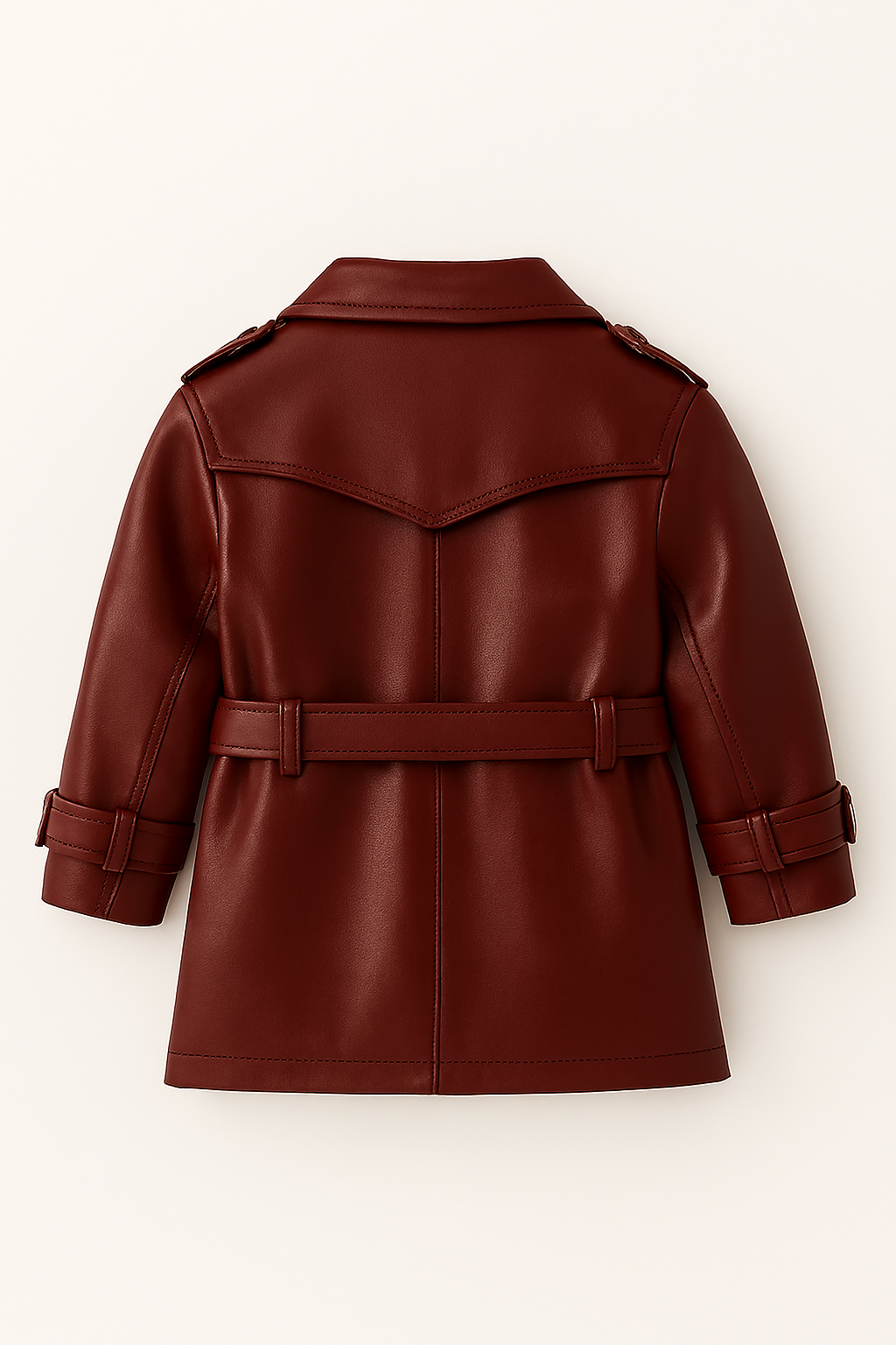 Sophistication meets warmth in our Real Sheep Leather Kids Trench Coat, designed for children aged 2 to 12. Crafted from premium sheep leather in a rich burgundy tone, this coat features a classic double-breasted silhouette with a wide lapel collar, shoulder epaulets, and a belted waist for a tailored fit.